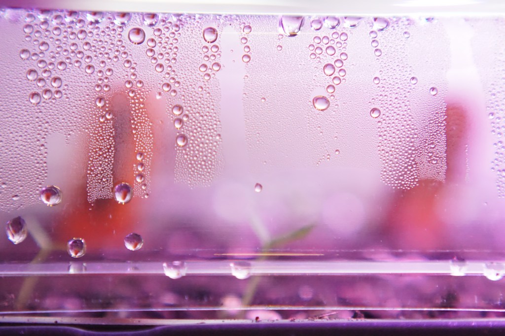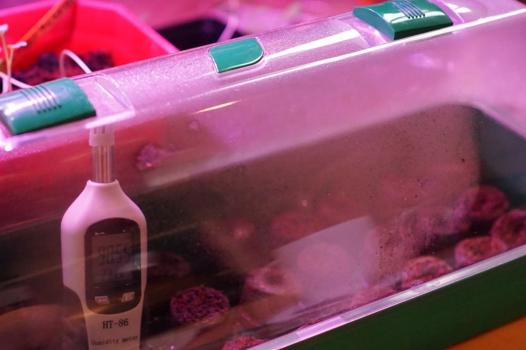 I’ve also used a larger dome for starting onion seeds. It comes with two sliding slots on the top to regulate the humidity. With the slots open at 3 mm, there is fog on the plastic maintaining 88.5% humidity. Unfortunately, the large Stuttgart onions failed to germinate, but at least the smaller white onions were good.