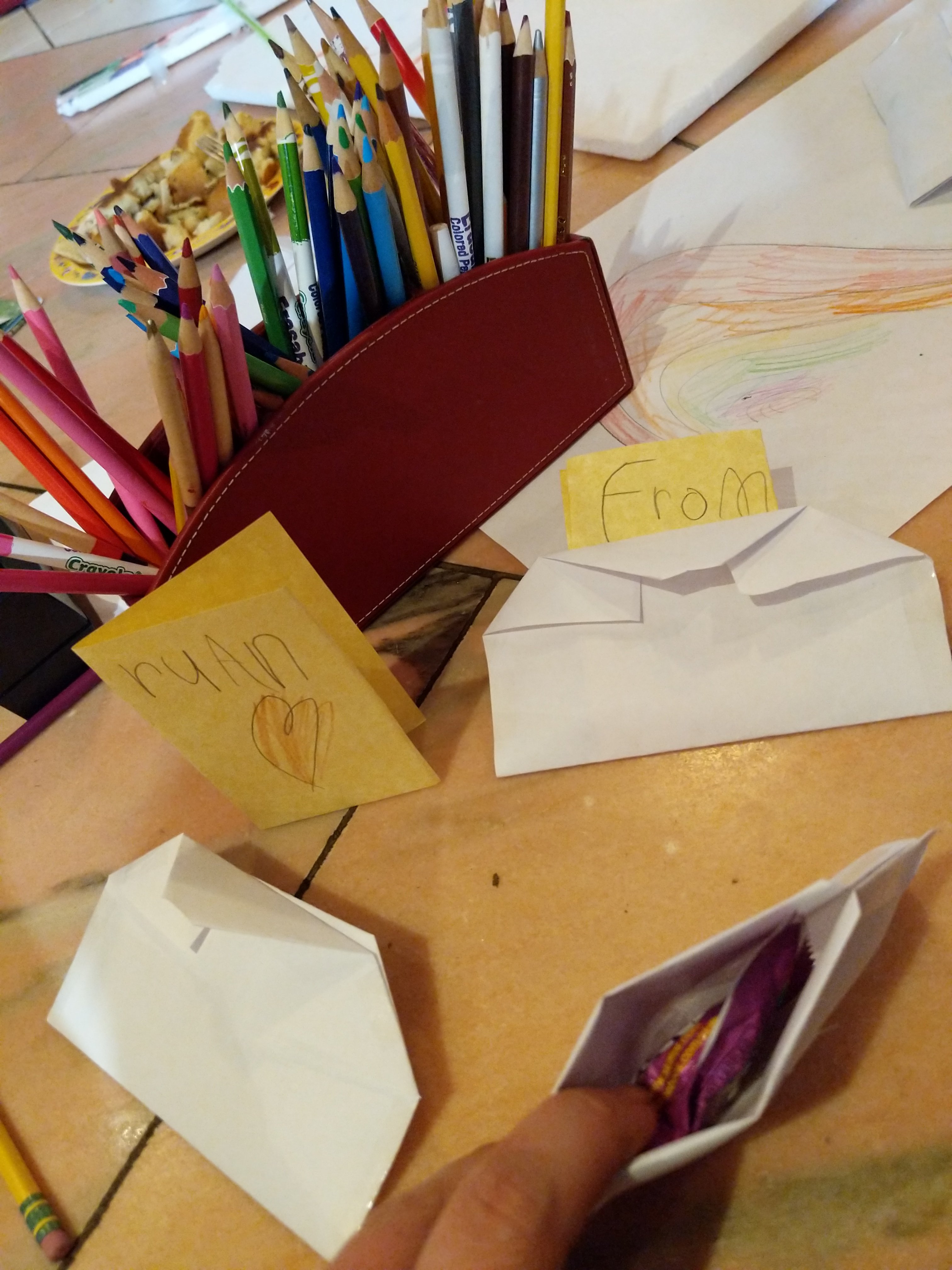 For the envelope, we cut up some more paper, and folded the corners down to make a point in the middle, then folded the center triangle down, like making a paper airplane. We used tape to secure the vertical and angled sides.