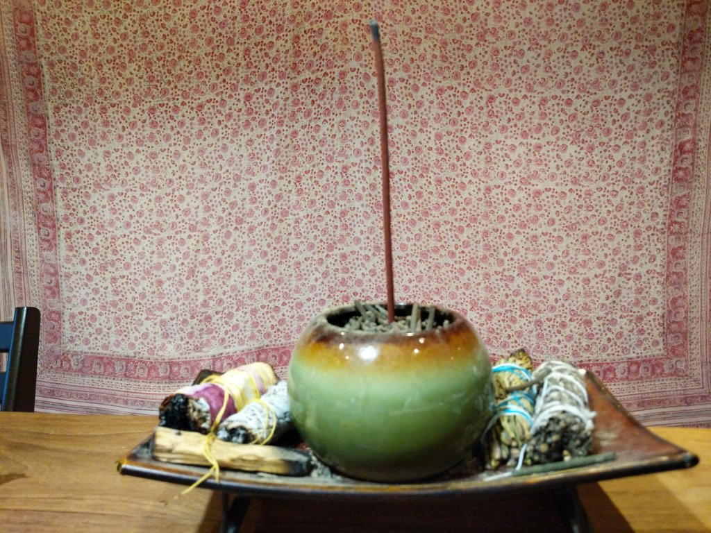 On the sides, I have the smudging bundles that I got from one single kit. It includes white sage, flower sage, cedar, Yerba Santa, and Palo Santa. I had never tried Palo Santo before, which comes from a highly oily tree found in the South American rain forest, allowing it to produce aromatic smoke.