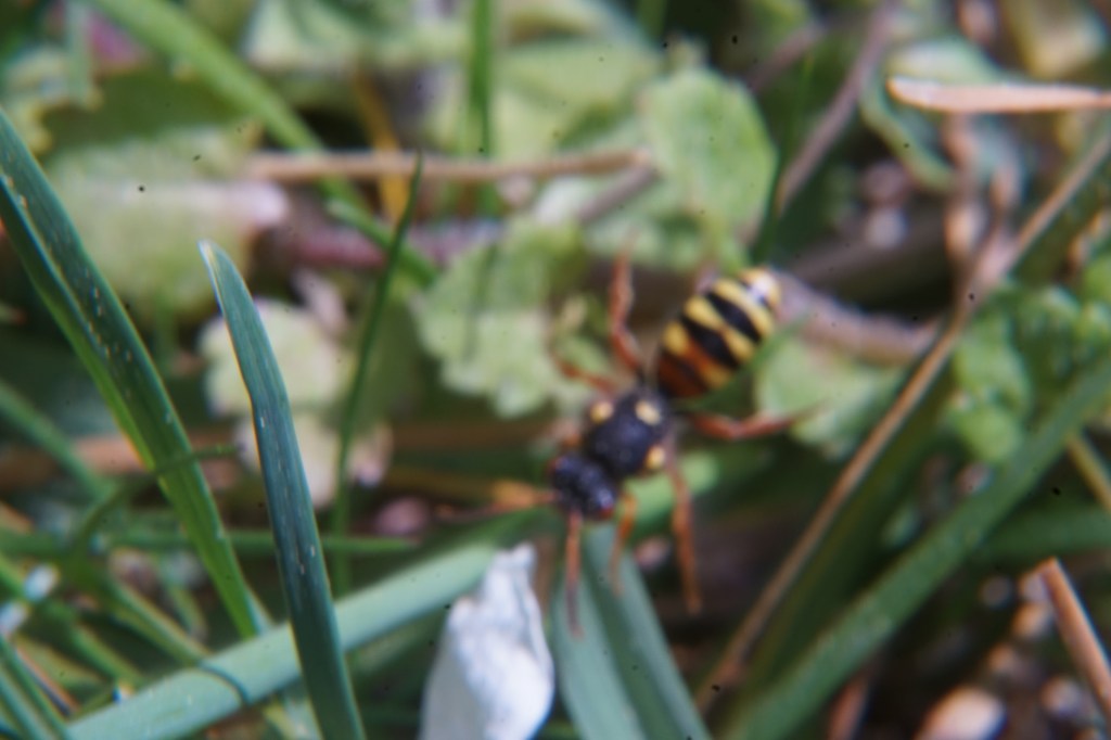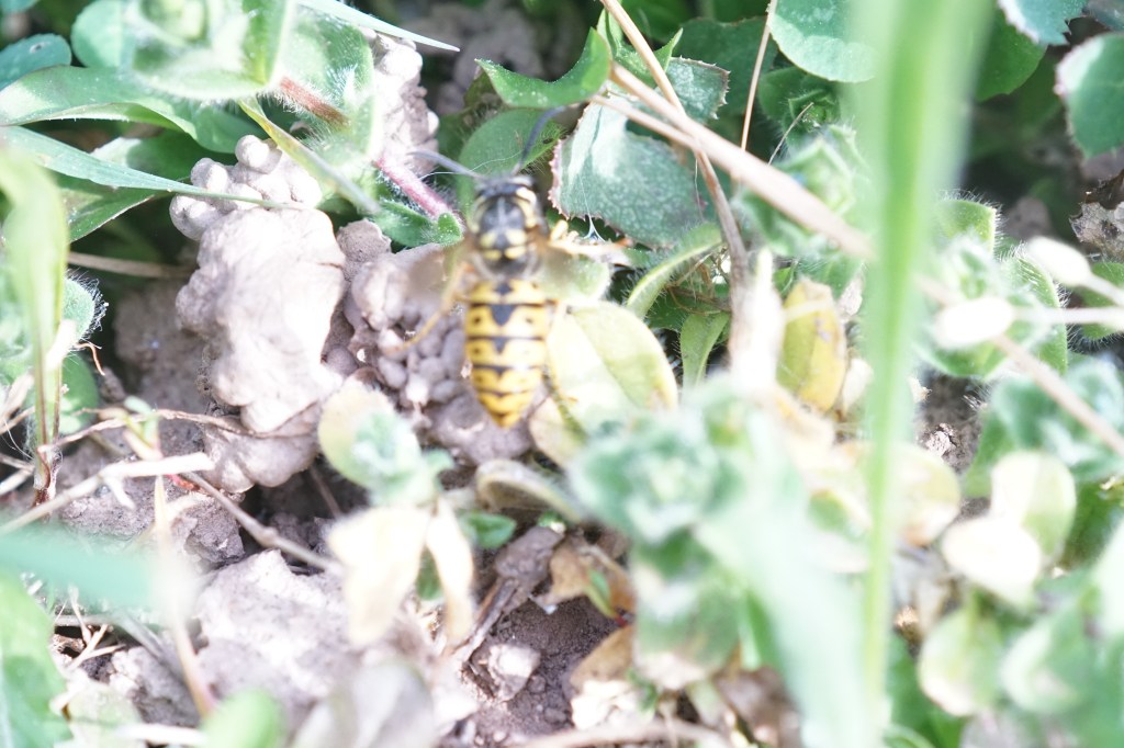 The German wasp is larger than a common one and can be distinguished by the clear yellow streak behind the eye. I believe that I found one of the underground nests, with the larger opening providing a landing pad, and showing a few cells broken open. [12] Supposedly, in early Spring a German wasp is usually within 500 meters of its nest. [13]