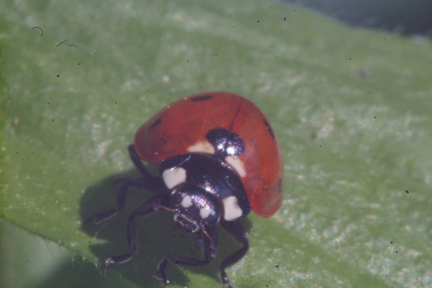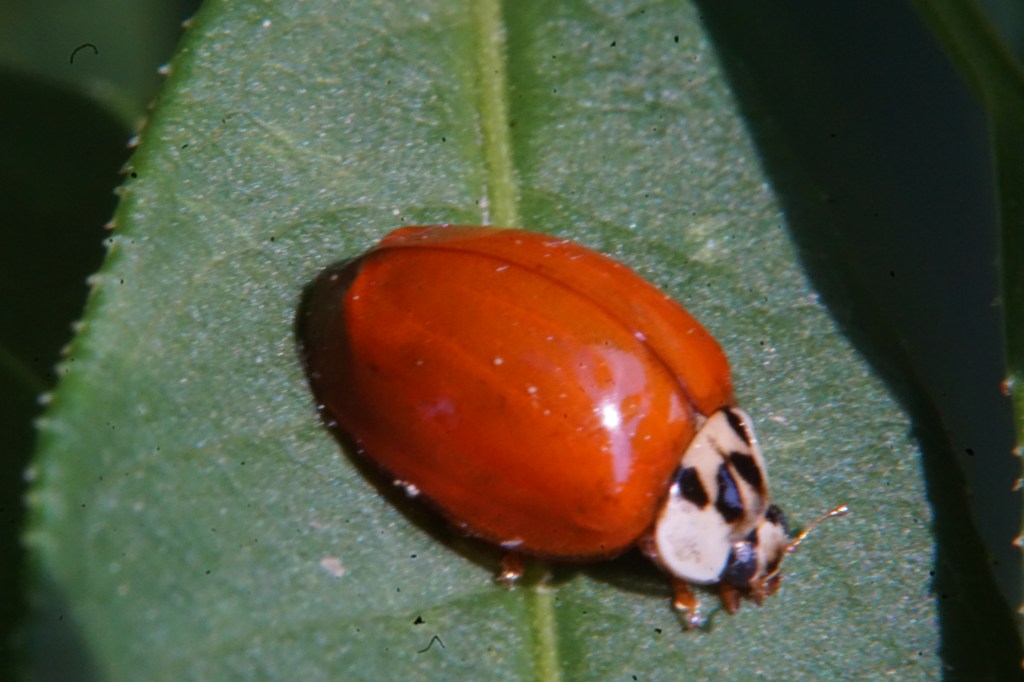 This one was trickier as it has no spots, however, the face is the main giveaway to what species this is. The broadly painted white cheeks with accents of black are the main clue, although the Asian Lady Beetle has significant variation in spots and color.