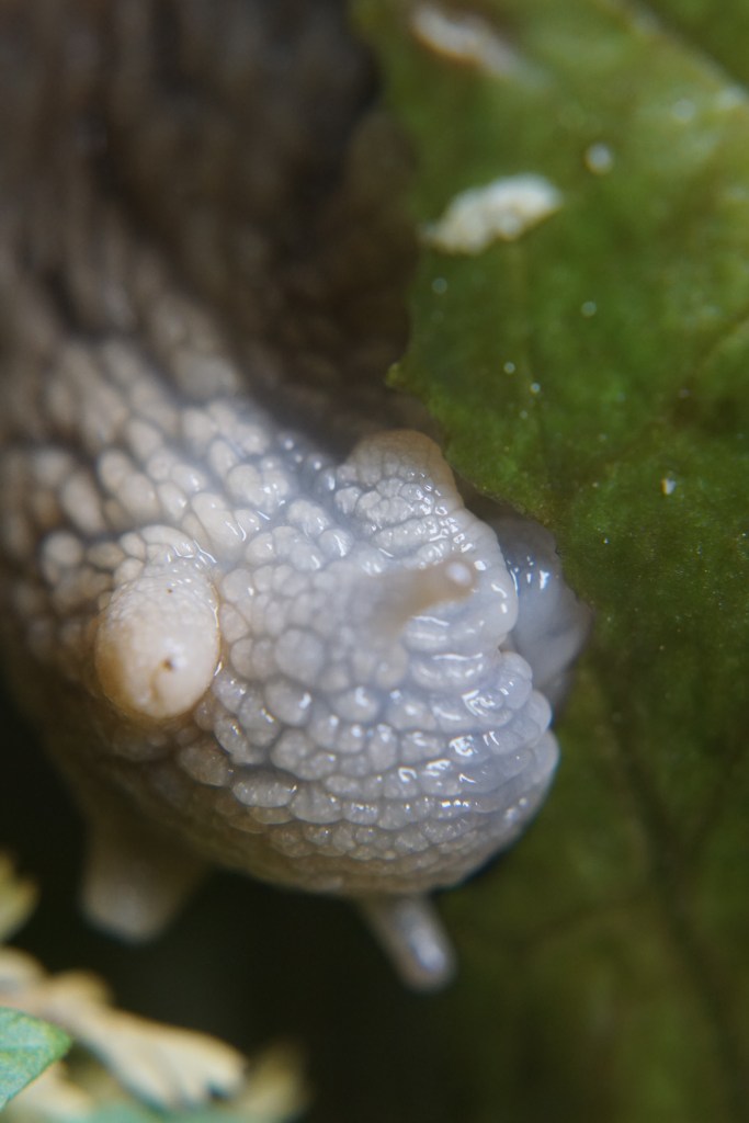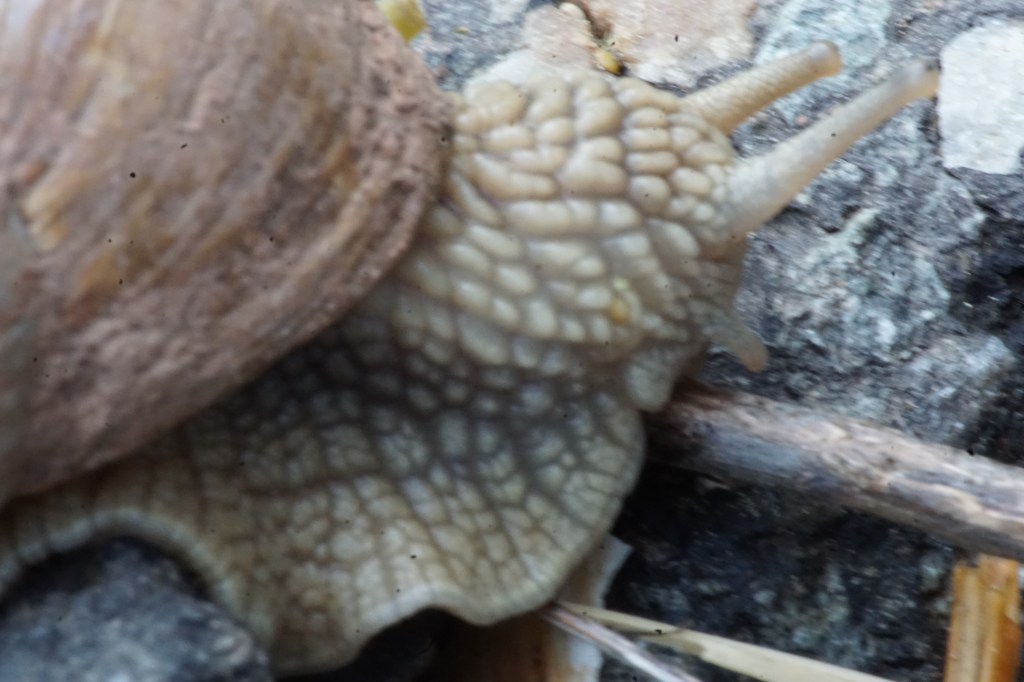 I did take one that I found in my garden inside for a couple days to observe. I learned that they are more active at night, so I rushed down as I was falling asleep to see him already climbed out of the bowl, so I put him outside. But truly, if you ever have a chance to feed a piece of lettuce to a snail, you will be so surprised to hear the sound of its mouth eating! I have a picture below that shows what looks like a version of teeth. It happily produced some excrement, which I mildly apologize for showing on this page.