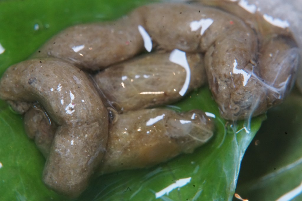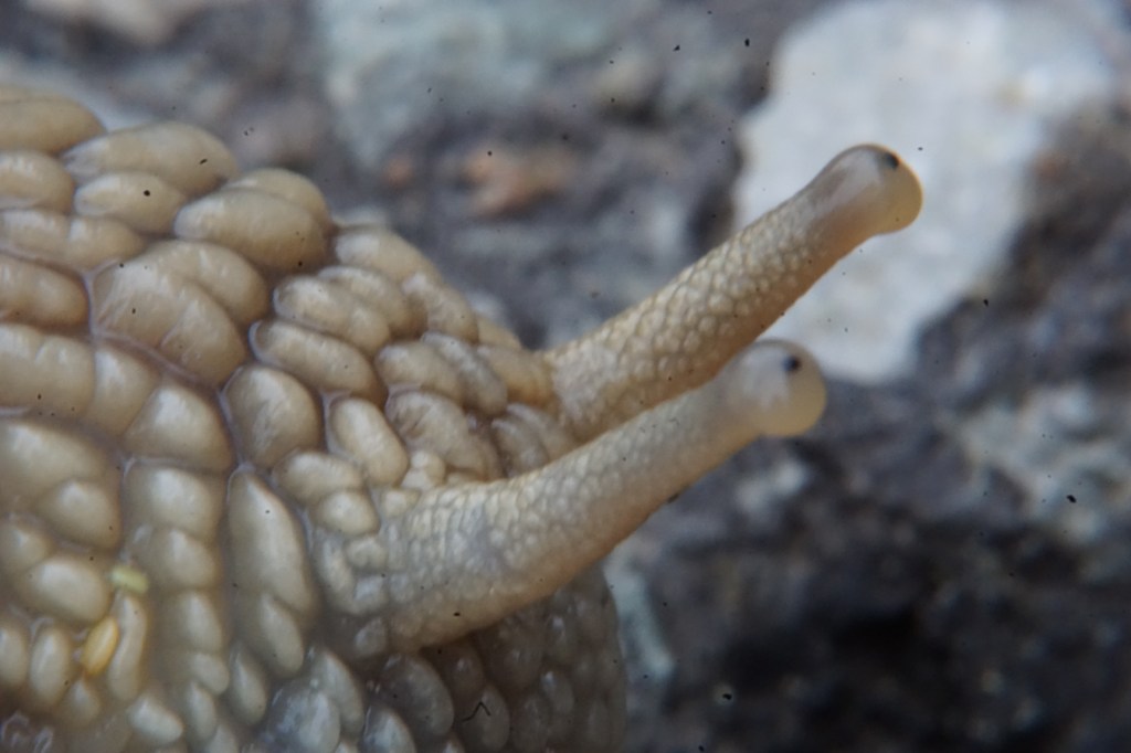 As you can see, it has a respiratory pore in the front part of the mantle on its round back and a foot fringe that is vertically striped, with a different color than the back. In late summer, I found a mating pair with what I believe is a blue penis in between.