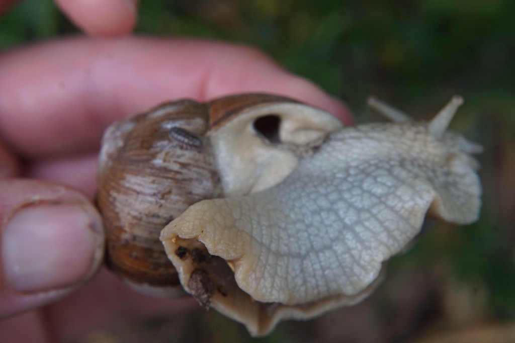 These he/shes (they’re hermaphrodites) were stuck on gravel that had just dried out, with a colony of about 20 venturing out onto a walking path were at least one was crushed by some unobservant passerby. I picked them all up and put them back in the bushes as it isn’t supposed to rain until at least the next day. There were several generations present, with the youngest in shells the length of 2 cm, and others in between.