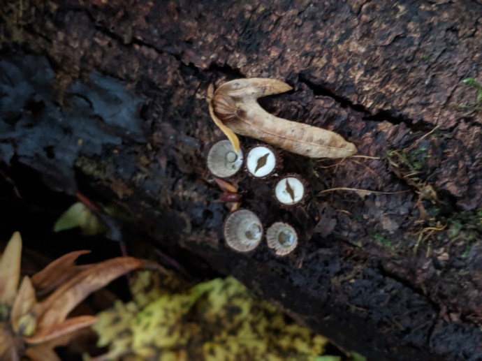This Bird’s nest cup-like fungus has a hairy, urn-shaped cupcake with white grooves on the inside. At maturity, the cover skin ruptures and releases up to 16 gray spore containers (peridioles) which are first attached to the cup by an umbilical cord. Present on deciduous and coniferous wood. All grow saprophyitically on wood or other plant remains. In German, the name translates to Striped Turkey, so I’m wondering if the inside looks like a Turkey tail – it’s interesting that the ‘Turkey Tail” above is known in German by it’s genus name.